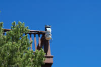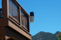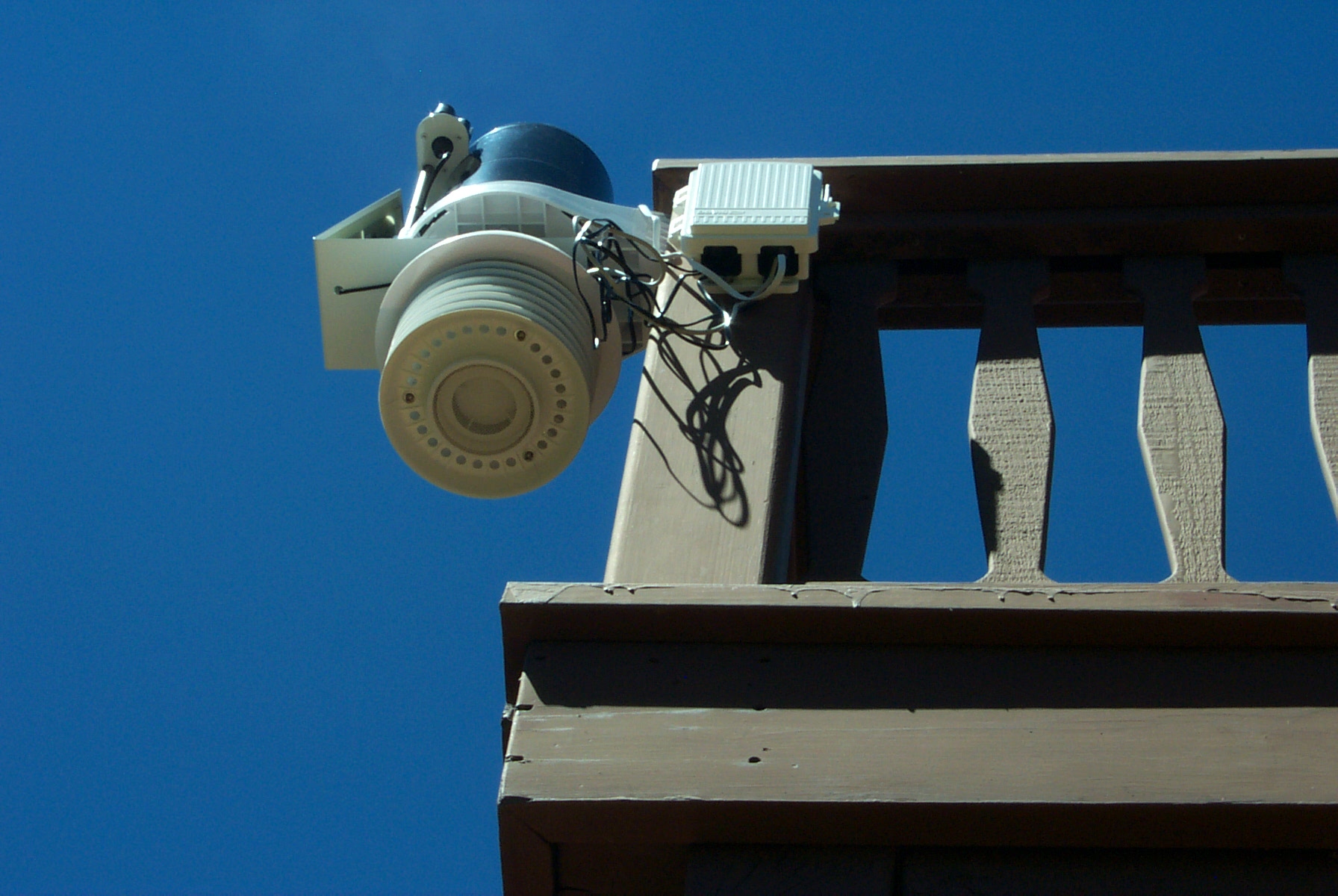 The ISS (integrated sensor suite) includes temperature, humidity, barometric, rain, solar and UV sensors. The white finned unit is a fan-aspirated radiation shield so that the readings are not affected by being in open sun light. On the far left is a solar panel powering everything. On the right is the wireless transmitter connecting the unit to consoles in the house -- as well as the computer. |